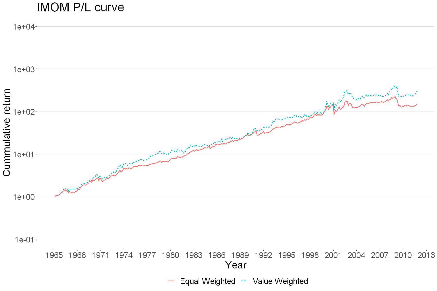Secondly, the graph show the profit and loss curve of the strategy, which reflects the amount would be earned if $1 is invested in 1965.